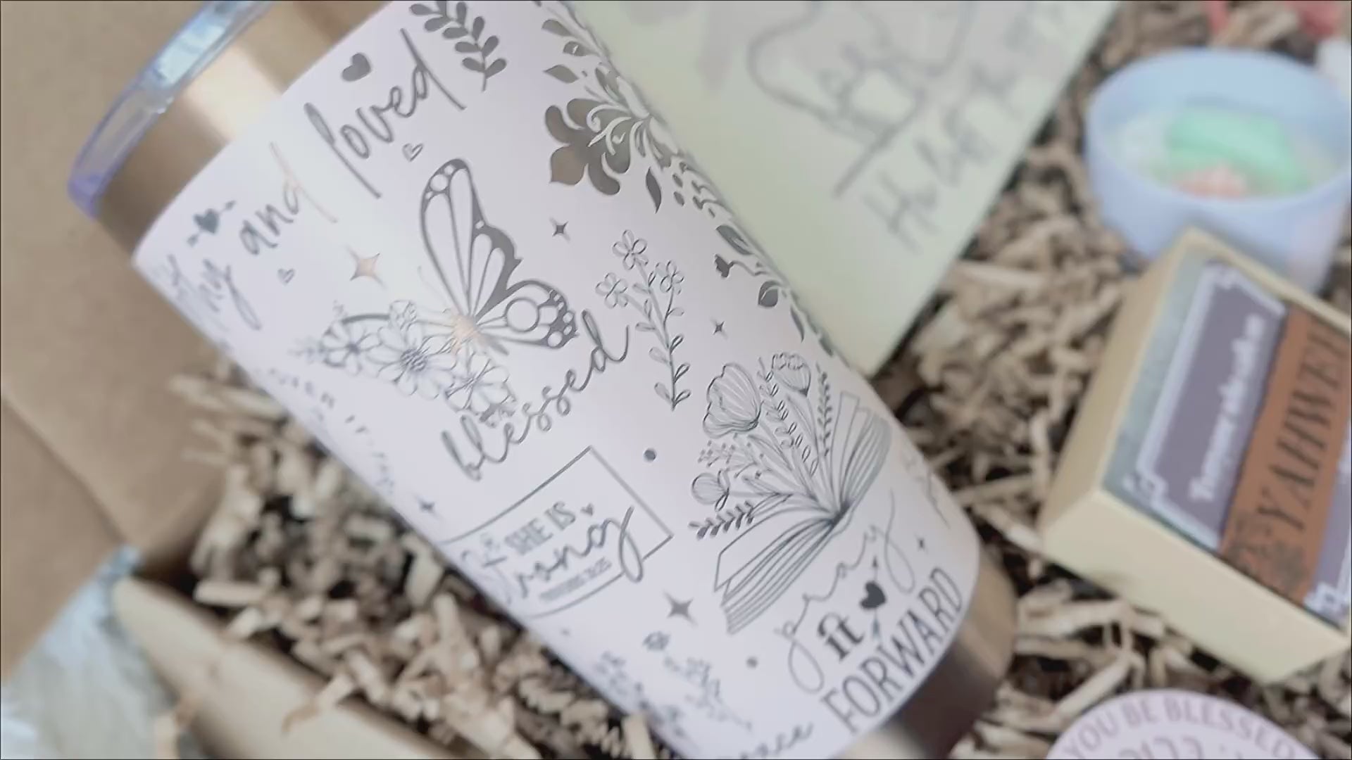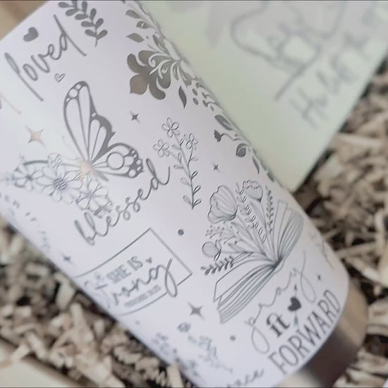 - 20 oz laser- engraved double walled tumbler : Choose your favorite design and scripture! Crafted from double-walled stainless steel, it keeps drinks hot or cold for hours while serving as a daily reminder to walk by faith and trust in His promises.